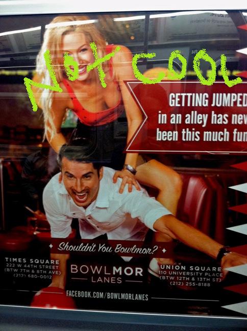 Really?! Not that it needs to be said, but ENOUGH WITH THE RAPE CULTURE, ALREADY! And frankly, not only is it offensive as a woman and a rape survivor, it’s offensive as a consumer. Do the asshats at Bowlmor think so little of New Yorkers that they believe this rape-y campaign will draw us to their over-priced lanes like moths to a flame?