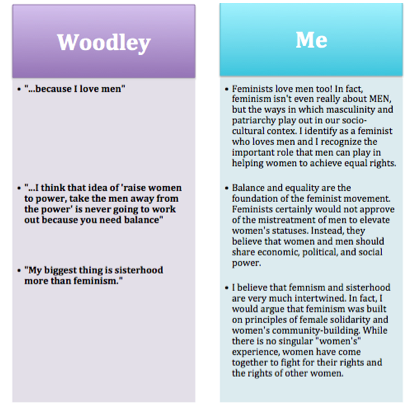 I think that Woodley’s response highlights the common misguided assumptions about what it means to be a feminist. To better clarify the focus of feminism, I refer to a few excerpts of her comments and compare them to my own beliefs.