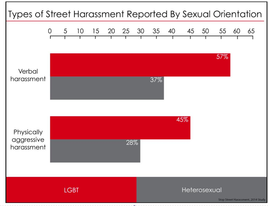 In addition to breaking down responses by sex, the report provides data disaggregated by race and sexual orientation. Perhaps unsurprisingly, people of color and those identifying as LGBT report experiencing harassment at higher rates.